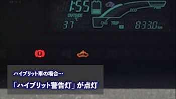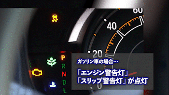 ハイブリット車は【ハイブリット警告灯】が点灯し。ガソリン車は【エンジン警告灯】と【スリップ警告灯】が点灯しています。